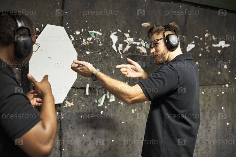 Инструктор демонстрирует стрельбу у чернокожего студента-мужчины в оружейном клубе