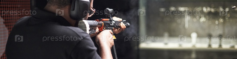 Чернокожий мужчина практикует стрельбу по целям с винтовкой на крытой дальности