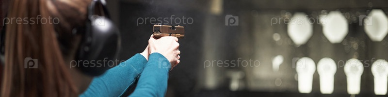 Молодая женщина практикует стрельбу из пистолета на крытой пулевой дальности