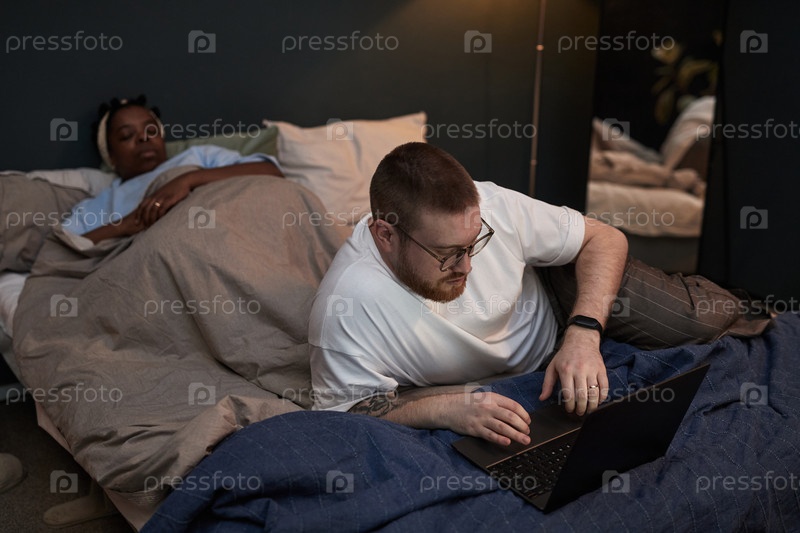 Молодой человек игнорирует молодую чернокожую женщину, используя ноутбук в постели