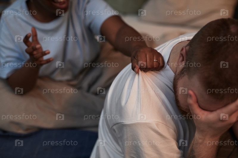 Молодой взрослый мужчина сидит расстроенным, в то время как чернокожая женщина спорит позади