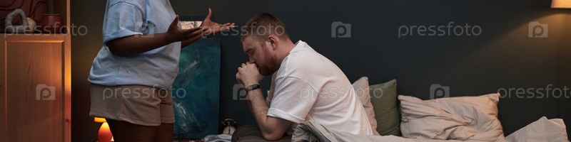 Сидит на кровати, пока чернокожая женщина жестикулирует во время спора
