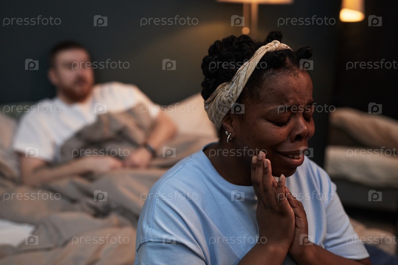 Черная женщина плачет, пока молодой человек сидит в постели и смотрит на молодого человека
