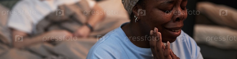 Чернокожая женщина среднего возраста плачет, сидя рядом с мужчиной в кровати