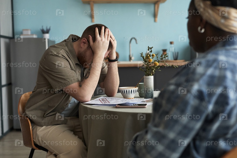 Молодой человек, держащий голову в руках перед лицом молодой чернокожей женщины, спорящей