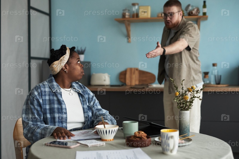 Молодой человек спорит с молодой чернокожей женщиной во время конфликта отношений