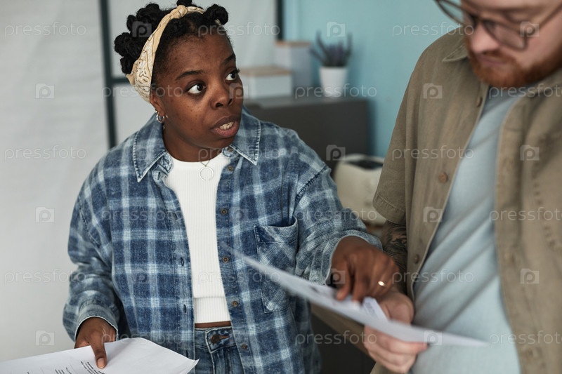 Молодая взрослая черная женщина спорит с молодым взрослым мужчиной в помещении