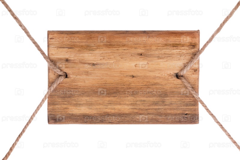 Старый деревянный знак из легкой древесины, висящий на веревках. изолирован