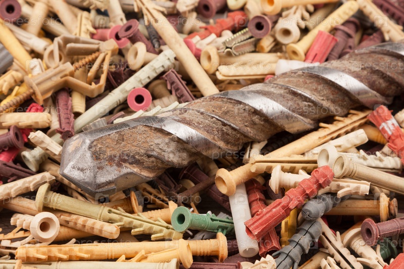 Старый бетонный дрель лежит на куче дюбелей
