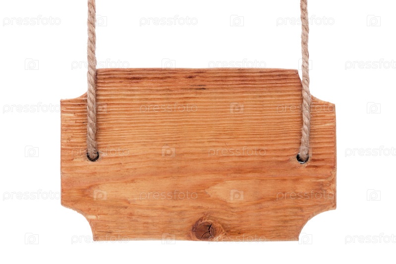 Старый деревянный знак из легкой древесины, висящий на веревках. изолирован