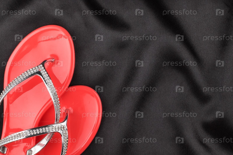 Розовые сандалии, украшенные стеклянными камнями, лежат на черной ткани
