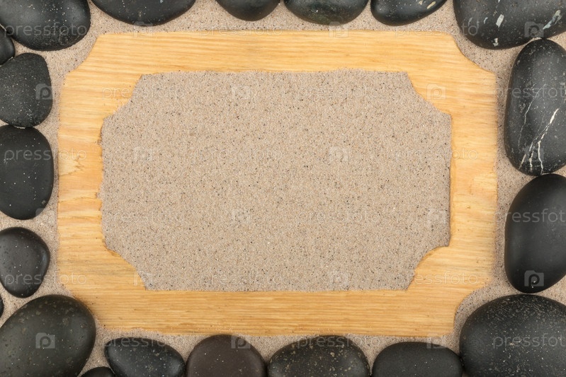 Рама из светлого дерева на песке и черные камни вокруг. с пространством для текста