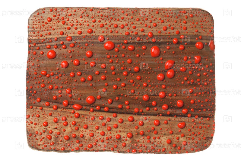 Красивые капли красной краски на деревянной раме из древесины. изоляция
