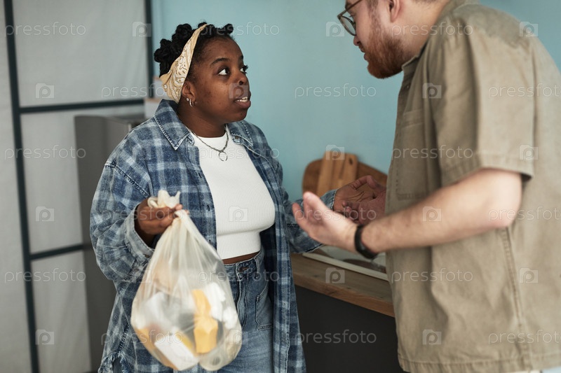 Молодая чернокожая женщина и молодой мужчина спорят во время конфликта на кухне