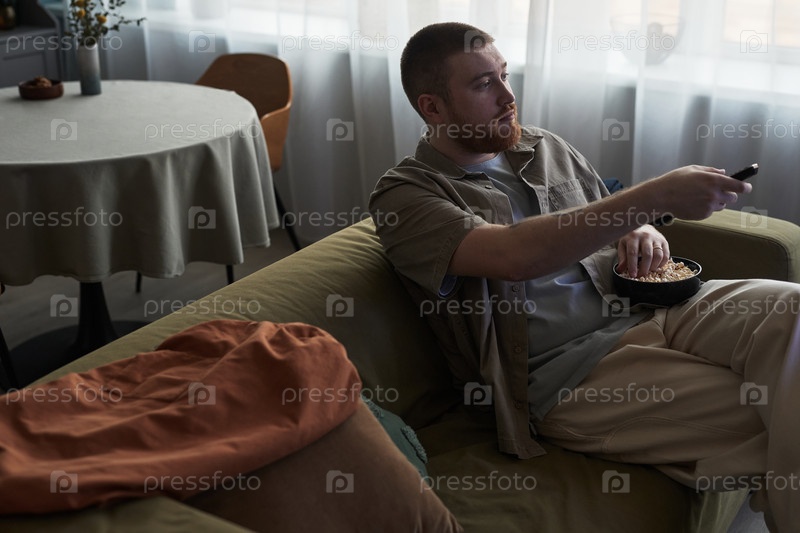 Молодой человек сидит на диване и смотрит телевизор во время конфликта