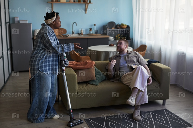 Молодая взрослая чернокожая женщина спорит с молодым мужчиной в гостиной