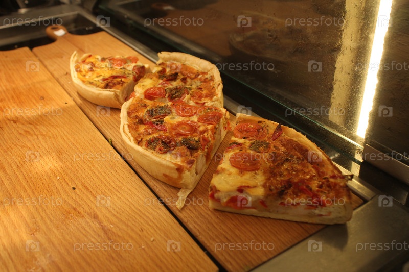 Торт-кише с мясной начинкой, нарезанный на кусочки в витрине