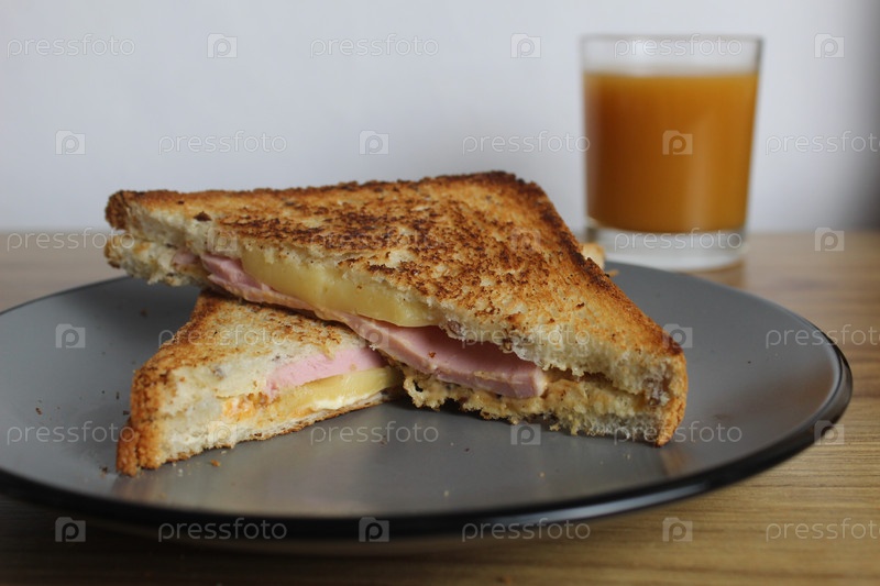 Еда, завтрак. сэндвичи из ветчины и овощной Хелен лежат на серой тарелке рядом с апельсиновым абрикосовым соком на столе. приготовление завтрака