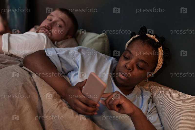 Молодой человек смотрит, как молодая чернокожая женщина использует смартфон в постели