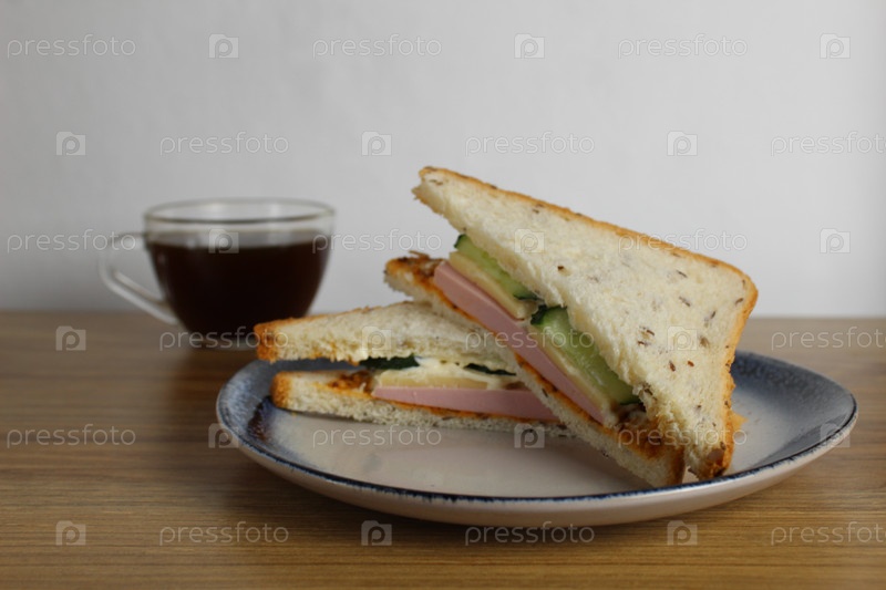 Завтрашняя закуска сэндвич с колбасой из ветчины и сыра огурцы лежит на тарелке рядом со стаканом чая или кофе