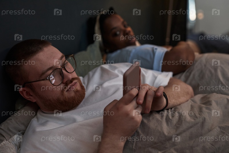 Молодой взрослый мужчина использует смартфон, в то время как чернокожая женщина отворачивается