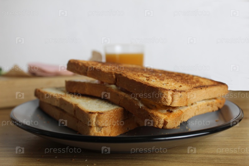Еда, завтрак. сэндвичи из ветчины и овощной Хелен лежат на серой тарелке рядом с апельсиновым абрикосовым соком на столе. приготовление завтрака