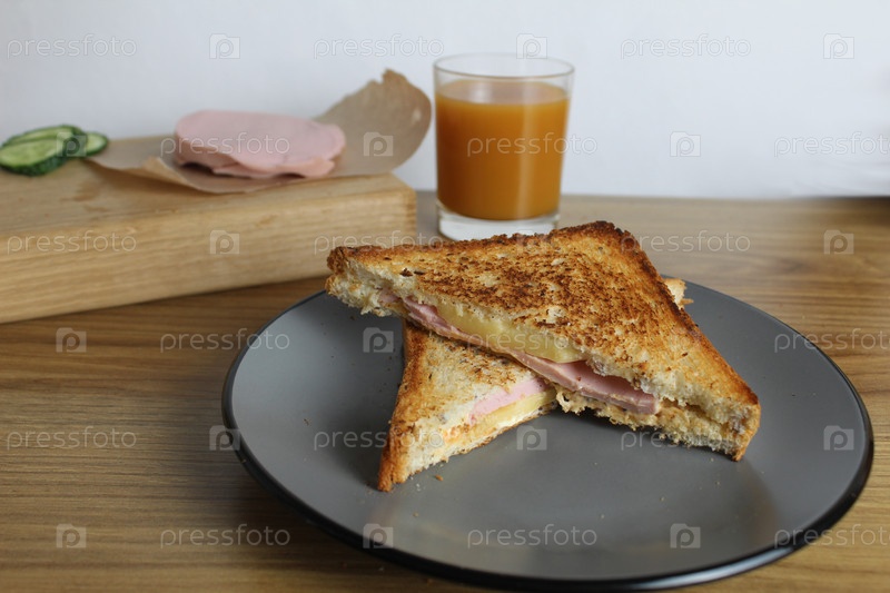 Еда, завтрак. сэндвичи из ветчины и овощной Хелен лежат на серой тарелке рядом с апельсиновым абрикосовым соком на столе. приготовление завтрака