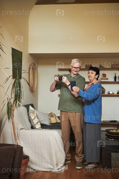 Пожилая пара улыбается, используя смартфон и фотокамеру