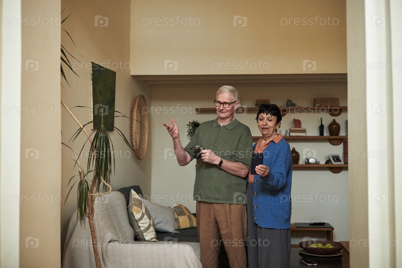 Пожилая пара держит гаджеты в уютной гостиной