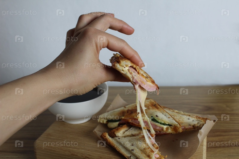 Девочка ломает сэндвич из сыра своими руками.Завтрак.Процессированный сыр