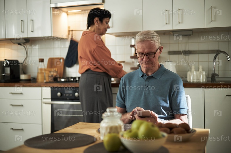 Пожилой мужчина пишет смс, в то время как женщина готовит на кухне
