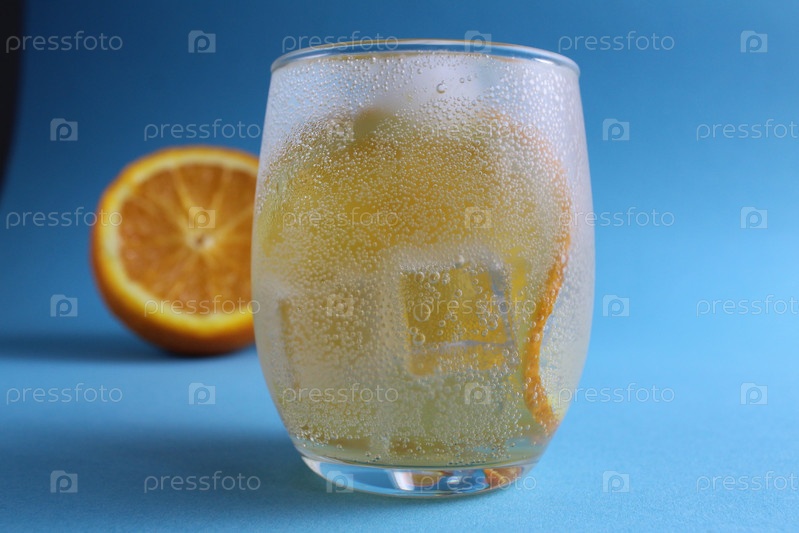 Шаг за шагом приготовление лимонада. шаг 2. залить фруктовый апельсин газированной водой. стакан лимонадного апельсина на синем фоне с местом для текста. крупный план