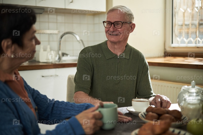 Пожилой мужчина завтракает с женой на кухне