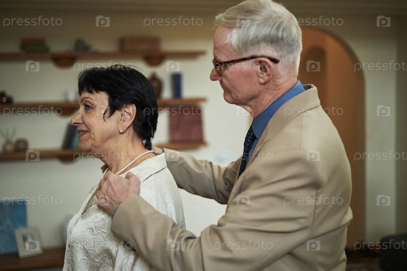 Старший мужчина помогает жене надеть ожерелье на вечеринку