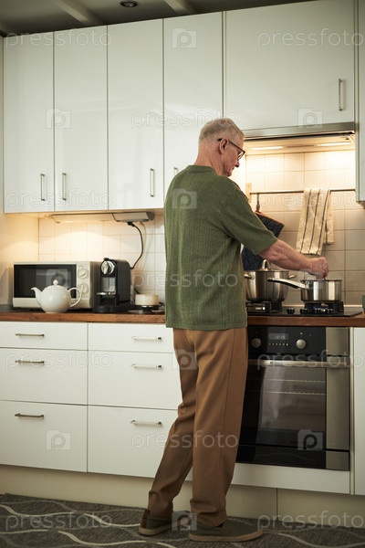 Старший мужчина готовит пищу на современной кухне с помощью плиты
