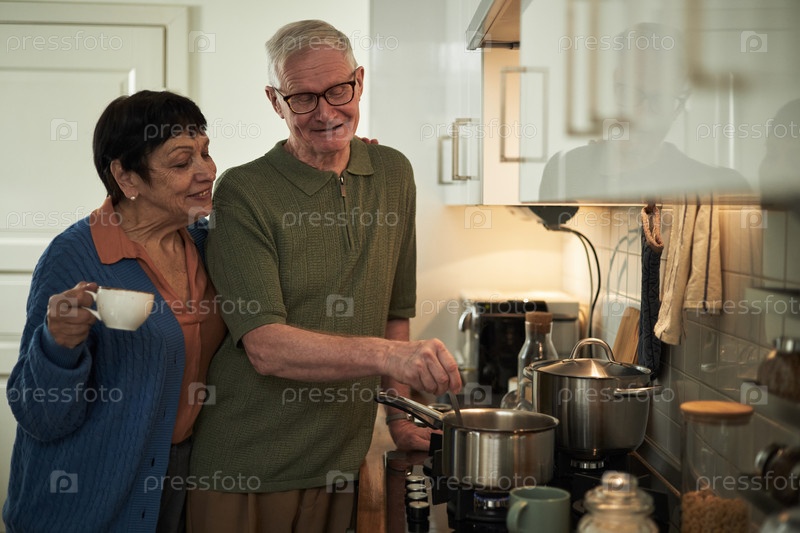 Счастливая пожилая пара, готовящая вместе на кухне
