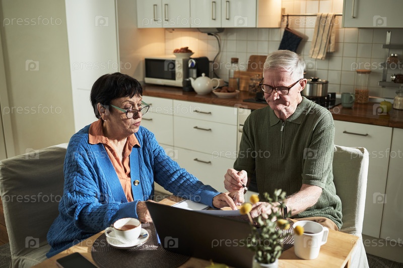 Пожилая пара использует ноутбук на кухне