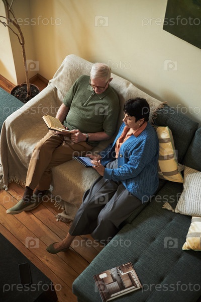 Пожилая пара сидит на диване, читает и использует планшет