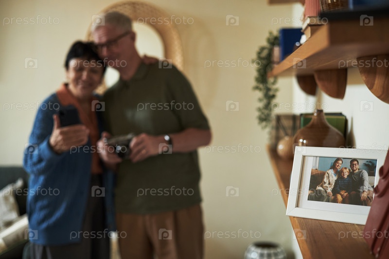Старшая пара позирует со смартфоном в уютной гостиной