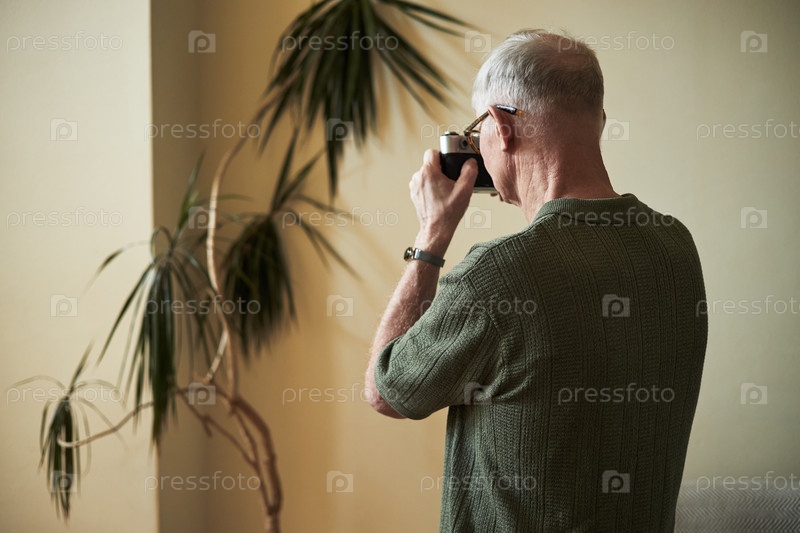 Старший мужчина фотографирует с помощью винтажной камеры в помещении