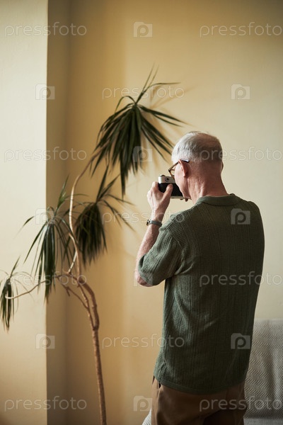 Пожилой мужчина фотографирует комнатные растения с помощью винтажной камеры