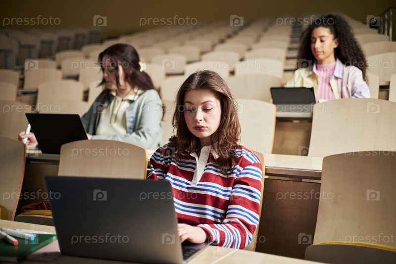 Мультиэтническая группа молодых взрослых женщин, изучающих с помощью ноутбуков в лекционном зале