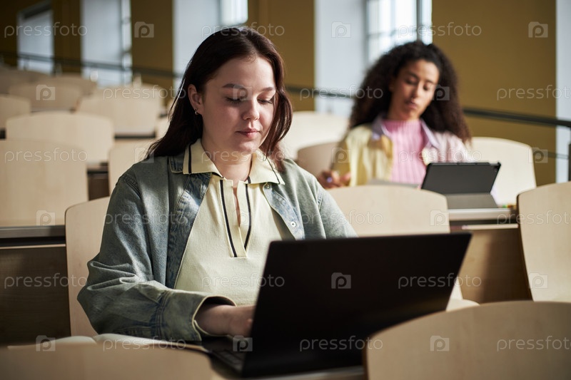 Молодая женщина использует ноутбук во время учебы рядом с мультиэтническим студентом