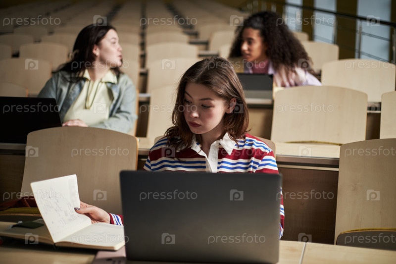 Мультиэтническая группа молодых взрослых женщин, учащихся вместе в университетском лекционном зале