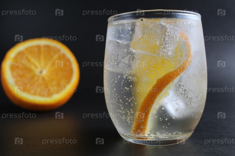 Лимонада с апельсином и льдом в стакане на черном фоне лежит рядом со льдом и оранжевым. летний напиток на чёрном фоне
