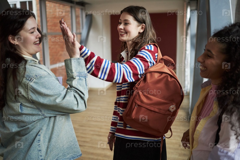 Мультиэтническая группа молодых женщин смеются и пятёркают на кампусе колледжа