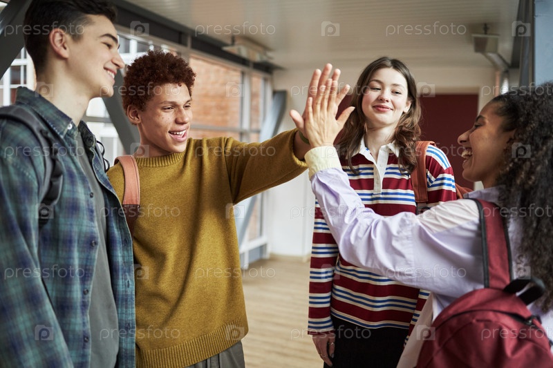Группа разнообразных университетских подростков, улыбающихся и высоких пяток в помещении