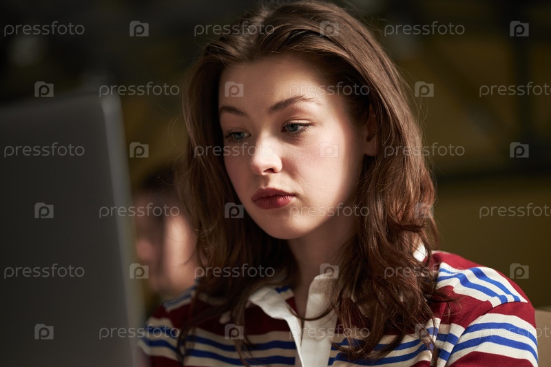 Молодая взрослая женщина учится на ноутбуке в университетском классе