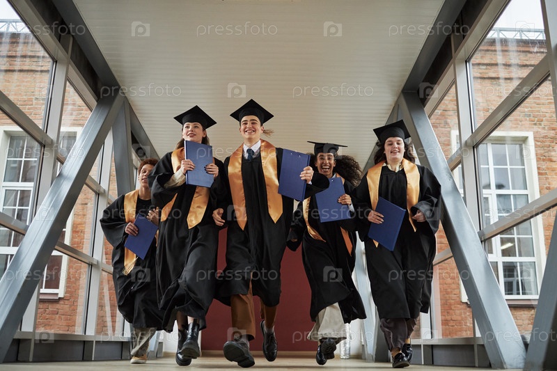 Мультиэтнические молодые выпускники, бегущие с радостью по пешеходной дорожке университета