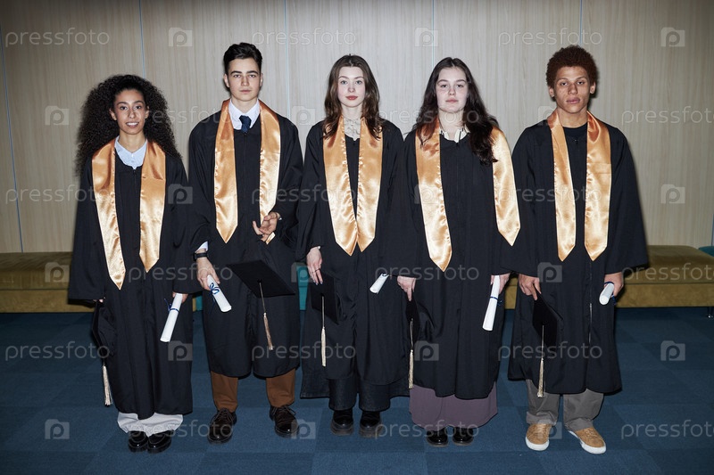 Разнообразная группа молодых студентов университета, одетых в выпускные халаты и улыбающихся